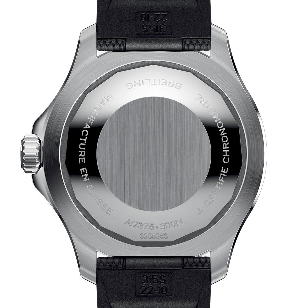 Aside from looking good, the new Superocean is also a technical marvel. Broad hands and indexes coated in luminescent Super-LumiNova allow for superior readability underwater. At 300 m (1000ft) water resistance, this watch triples the minimum requirement for dive watches. The two strap options (rubber and metal bracelet) have a folding clasp that allows for micro-adjustments of up to 15 mm for easy wear over rashies and dive suits. Its scratch-proof ceramic-inlayed bezel means it will never wear or fade. For safety, the bezel is uni-directional on most sizes and bi-directional with a patented lock on the 46 mm. This watch is also shock, -sand-and saltwater-resistant. Its automatic Breitling Caliber 17 comes with a two-year warranty and approximate 38-hour power reserve.