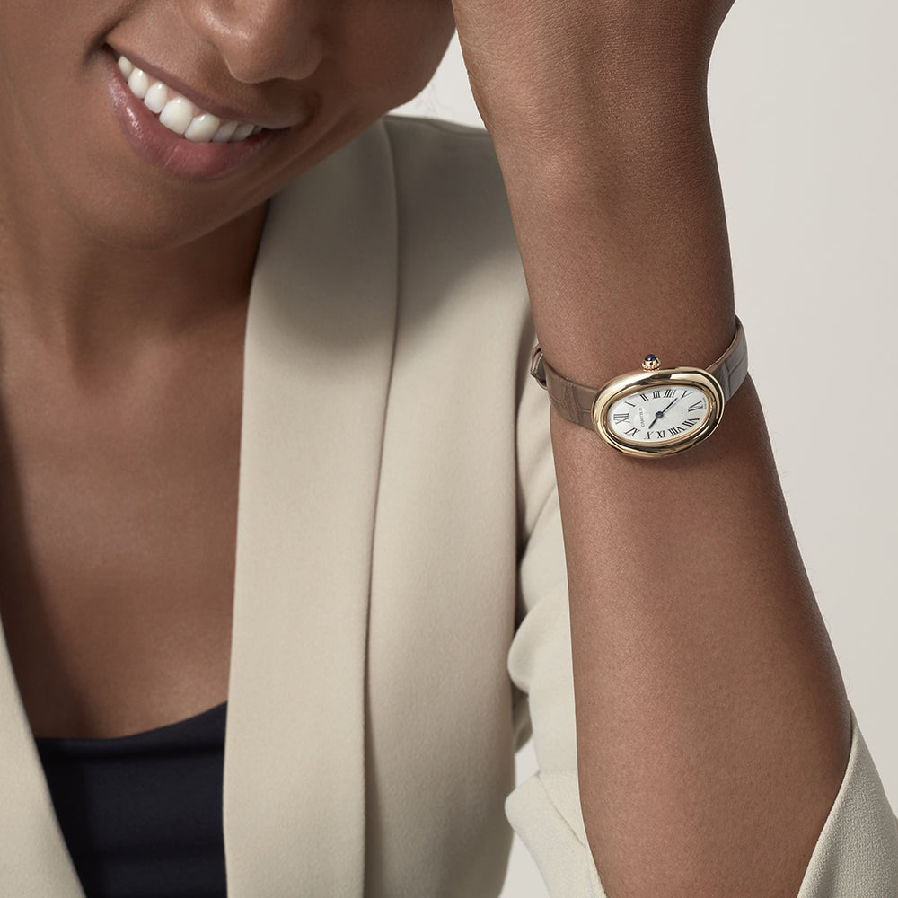 Baignoire watch, small model, quartz movement. 18K yellow gold case. Beaded 18K yellow gold crown set with a sapphire cabochon. Silvered dial, blued-steel sword-shaped hands, sapphire crystal. Taupe alligator-skin strap, 18K yellow gold ardillon buckle. Dimensions: 32 mm x 26 mm. Thickness: 8 mm. Water-resistant to 3 bar (approx. 30 metres). The 1906 design of the watch that would later be christened the “Baignoire” demonstrated Cartier's prowess in crafting watchmaking forms. A discreetly elegant ellipse uniquely forged in a single line, the “Baignoire” watch is the essence of Cartier style: a unique marriage of purity and timeless chic.