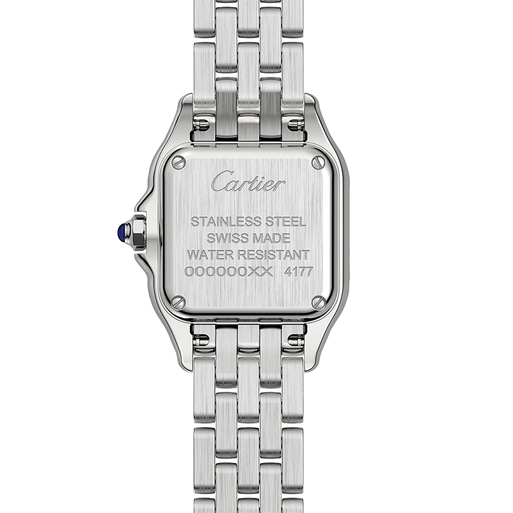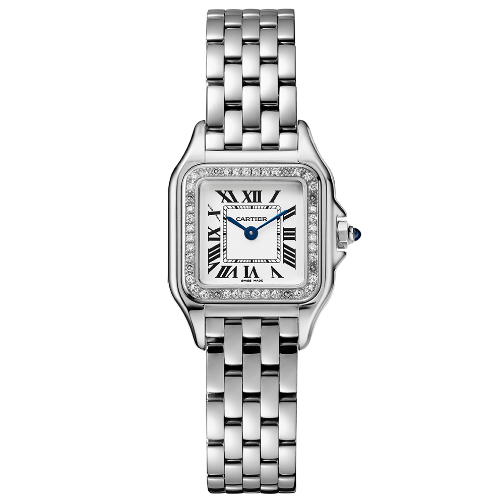 At once a watch and jewel, the Panthère de Cartier timepiece is one of the most distinctive Cartier designs. Born in the 80s and more contemporary than ever, it is a true style icon for women who wish never to go unnoticed. This small model, quartz, Panthère de Cartier is cased in steel with a diamond set bezel. This timepiece features a crown set with a synthetic blue spinel, silvered dial, blued-steel sword-shaped hands, steel bracelet and is water-resistant to 3 bar (approx. 30 metres).