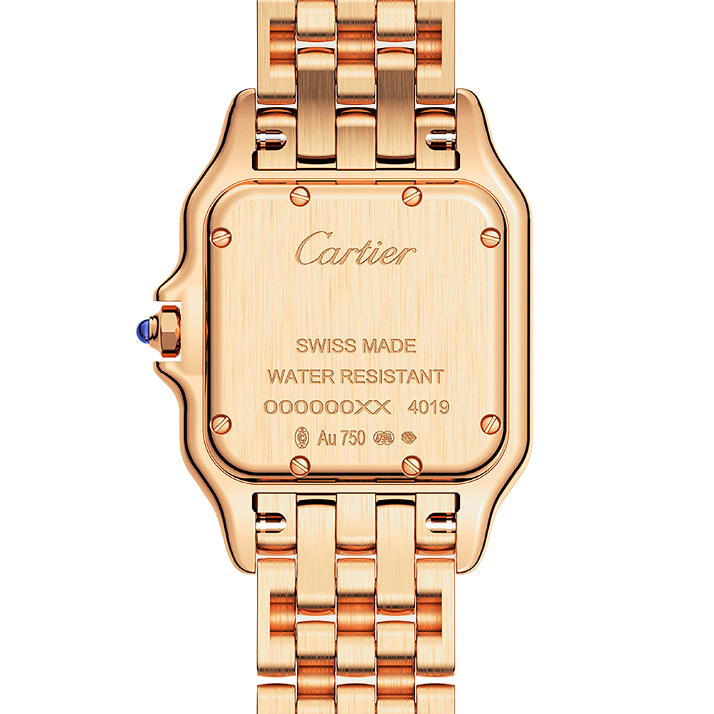 Panthère de Cartier watch, medium model, quartz movement. Case in rose gold 750/1000, dimensions: 29 mm x 37 mm, thickness: 7 mm, crown set with a blue sapphire, silvered dial, blued-steel sword-shaped hands, rose gold 750/1000 bracelet, water-resistant to 3 bar (around 30 metres).