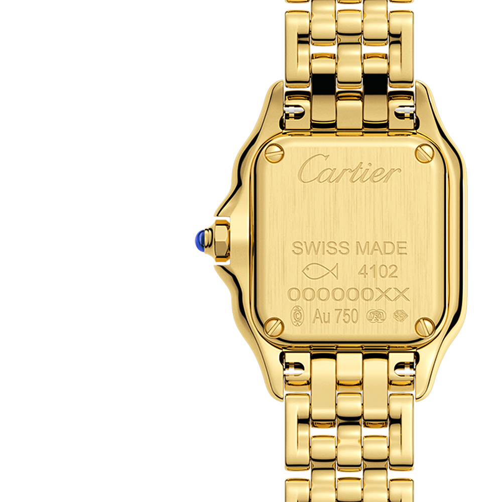 Panthère de Cartier watch, mini model, quartz movement. Yellow gold 750/1000 case and bracelet. Yellow gold 750/1000 octagonal crown set with a sapphire cabochon. Silvered dial, blued-steel sword-shaped hands, sapphire crystal.