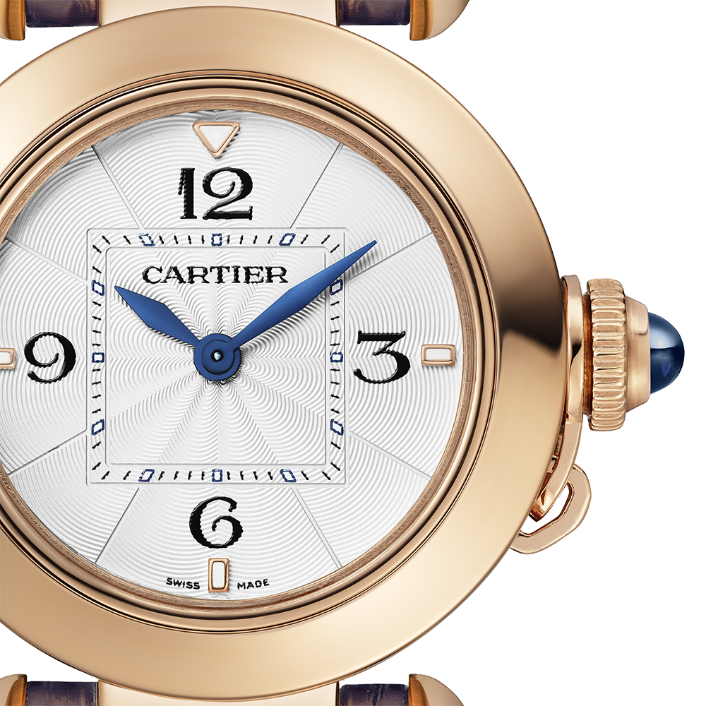 Pasha de Cartier watch, 30 mm, high autonomy quartz movement. 18K rose gold (750/1000) case, fluted crown cap and crown set with sapphires, opaline flinqué dial, blued steel diamond-shaped hands, navy blue alligator leather strap, second strap in grey alligator leather with "QuickSwitch" interchangeability system, interchangeable 18K rose gold (750/1000) deployant buckle. Case diameter: 30 mm, thickness: 8.22 mm. Water-resistant up to 3 bar (approx. 30 meters/100 feet).