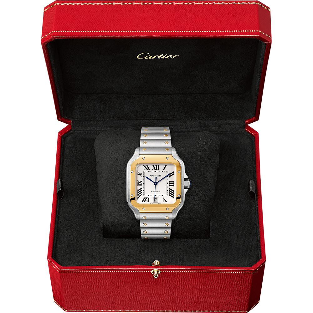 Santos large model watch, with a mechanical movement and automatic winding, calibre 1847 MC. Steel case and 18 carat yellow gold bezel, 7-sided crown set with a faceted synthetic spinel, silvered opaline dial, blued-steel sword-shaped hands, sapphire crystal. It is completed on a steel bracelet and is sold with a second bracelet in calfskin, with steel double adjustable folding buckle: both are fitted with the “QuickSwitch” interchangeability system.