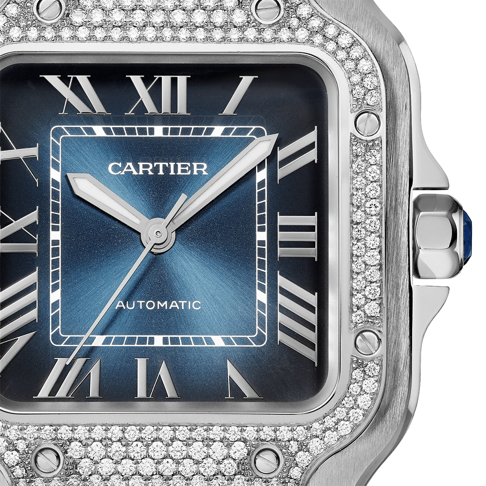 Santos watch, medium model, Manufacture mechanical movement with automatic winding, caliber 1847 MC. Steel case, steel bezel set with 206 brilliant-cut diamonds totaling 0.64 carats. 7-sided crown set with a faceted synthetic spinel, graduated blue dial, steel sword-shaped hands, sapphire crystal. Steel bracelet with "SmartLink" adjustment system. Second bracelet in alligator leather, with interchangeable steel deployant buckle. Both bracelets are fitted with the "QuickSwitch" interchangeability system. Case width: 35.1 mm, thickness: 8.83 mm. Water-resistant up to 10 bar (approx. 100 meters/330 feet).