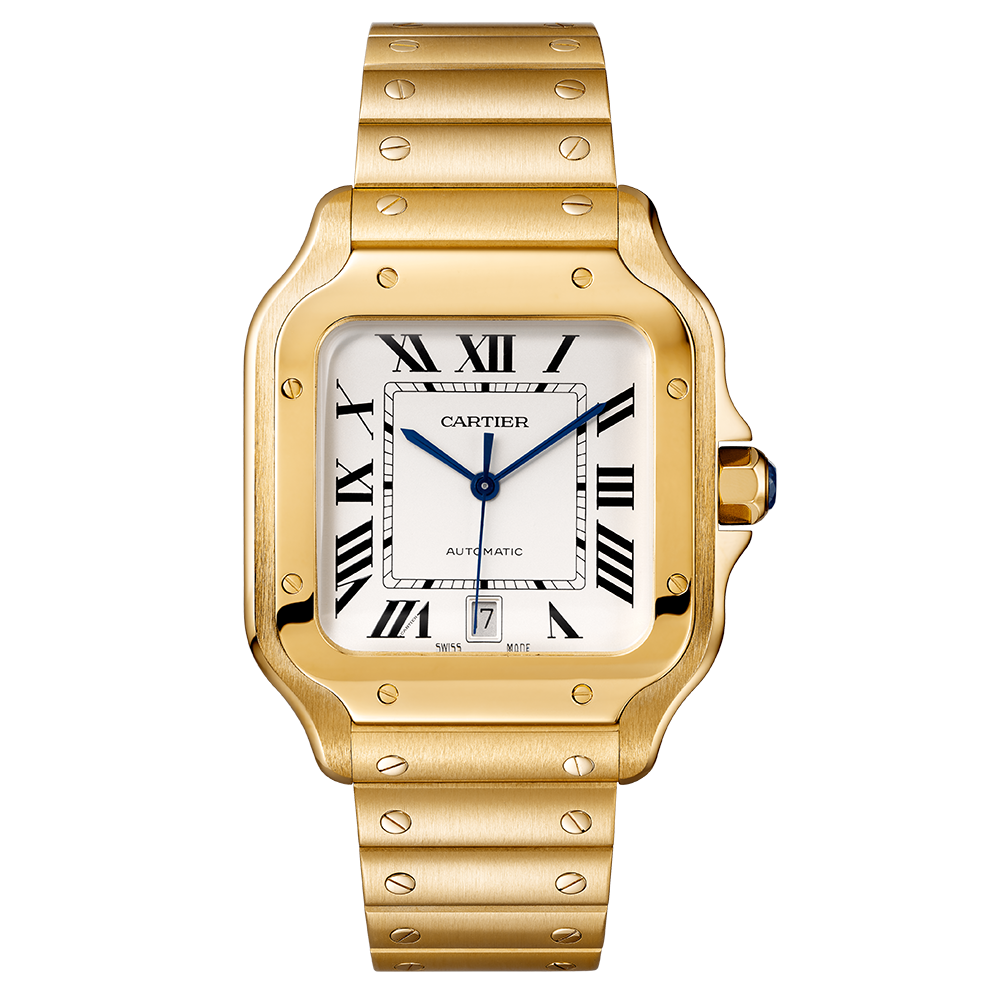Santos watch, large model, mechanical movement with automatic winding, calibre 1847 MC. Yellow gold 750/1000 case, yellow gold 750/1000 7-sided crown set with a faceted sapphire, silvered opaline dial, blued-steel sword-shaped hands, sapphire crystal. Yellow gold 750/1000 bracelet with “SmartLink” adjustment system. Second bracelet in alligator skin, with interchangeable yellow gold 750/1000 folding buckle. Both bracelets are fitted with the “QuickSwitch” interchangeability system. Case width: 39.8 mm, thickness: 9.38 mm. Water-resistant to 10 bar (approx. 100 metres).