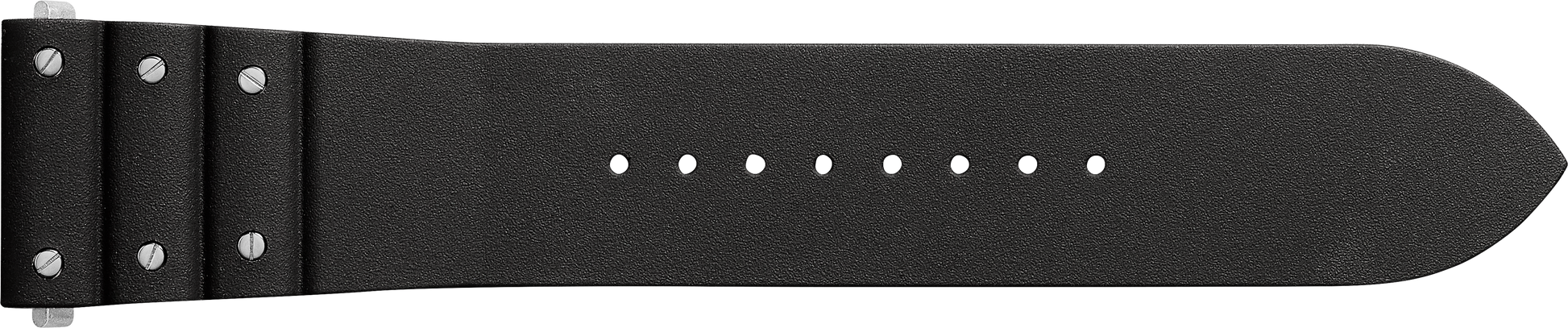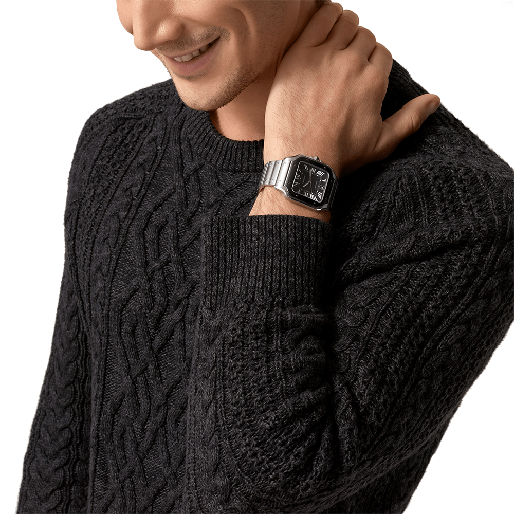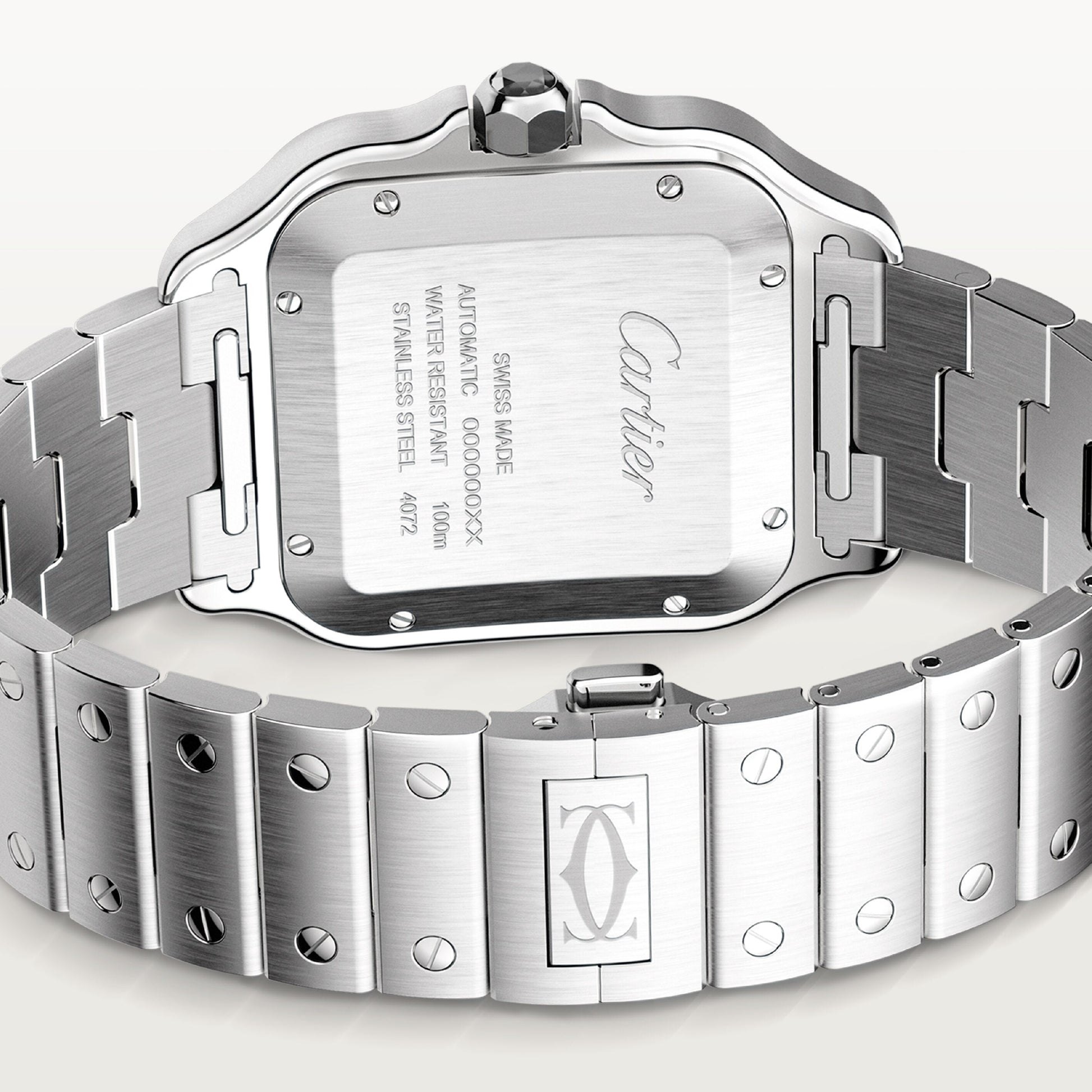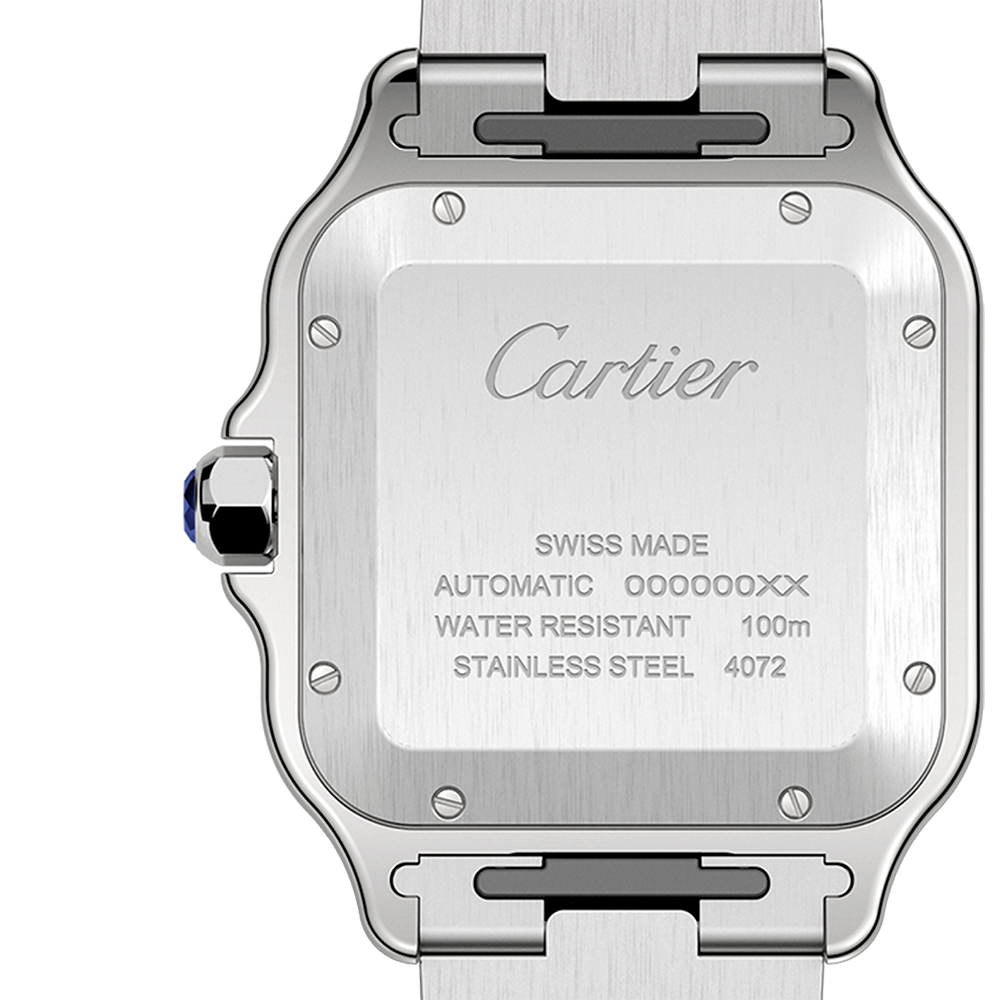Santos de Cartier watch, large model, Manufacture mechanical movement with automatic winding, calibre 1847 MC. Steel case, ADLC bezel, steel crown set with a faceted black synthetic spinel, grey dial, steel sword-shaped hands with luminescent material, sapphire crystal. Steel bracelet with "SmartLink" adjustment system. Second strap in black rubber, with interchangeable steel folding buckle. Both bracelets are fitted with the "QuickSwitch" interchangeable system.
