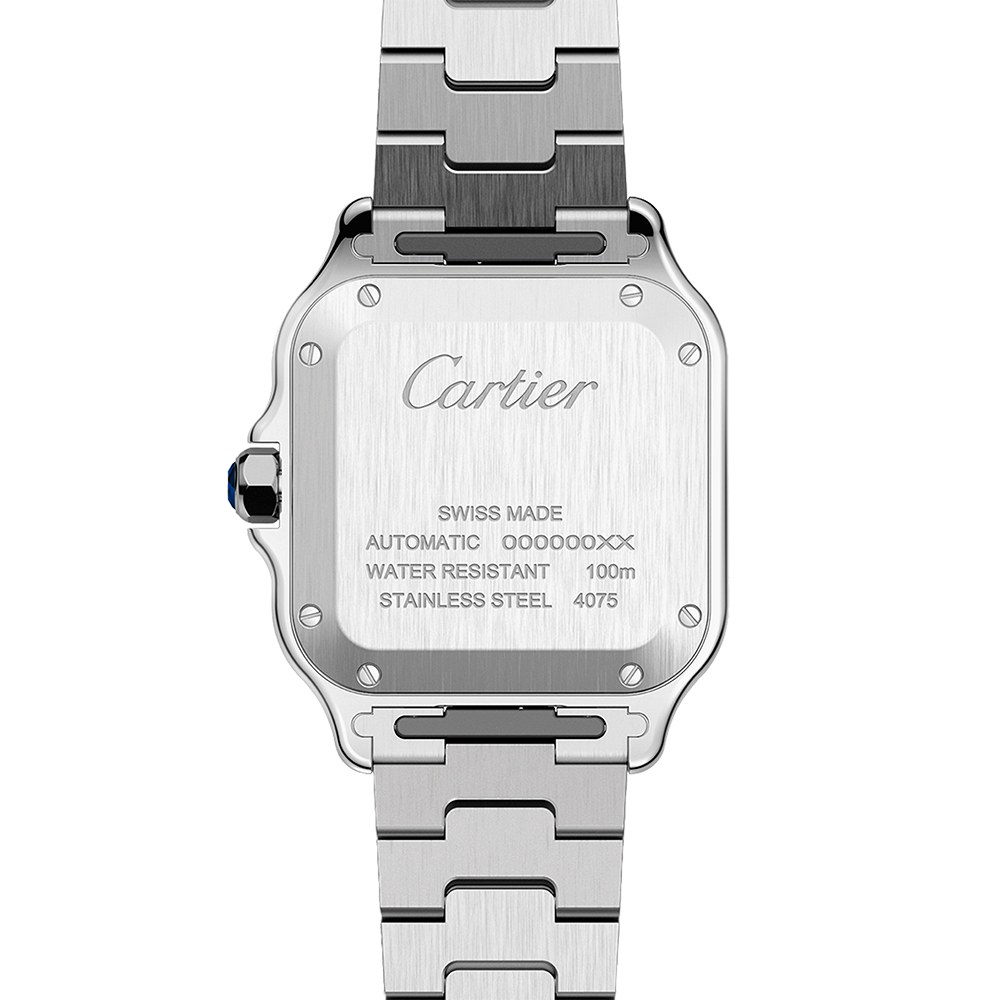Santos watch, medium model, mechanical movement with automatic winding, calibre 1847 MC. Steel case, 7-sided crown set with a faceted synthetic spinel, silvered opaline dial, steel sword-shaped hands, sapphire crystal. Steel bracelet with “SmartLink” adjustment.