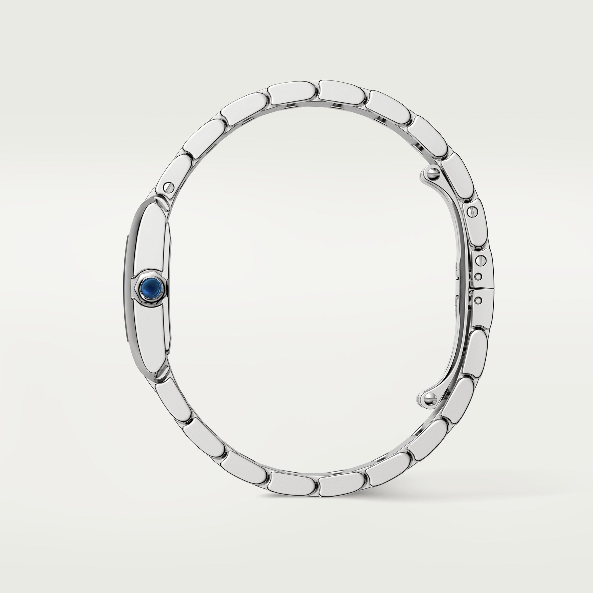 Tank Française watch, small model, quartz movement. Steel case. Faceted crown in steel decorated with a synthetic cabochon-shaped spinel. Silvered sunray dial, blued-steel sword-shaped hands, sapphire crystal. Steel bracelet. Case dimensions: 25.7 mm x 21.2 mm, thickness: 6.8 mm. Water-resistant to 3 bar (approx. 30 metres).
