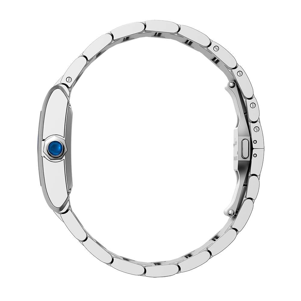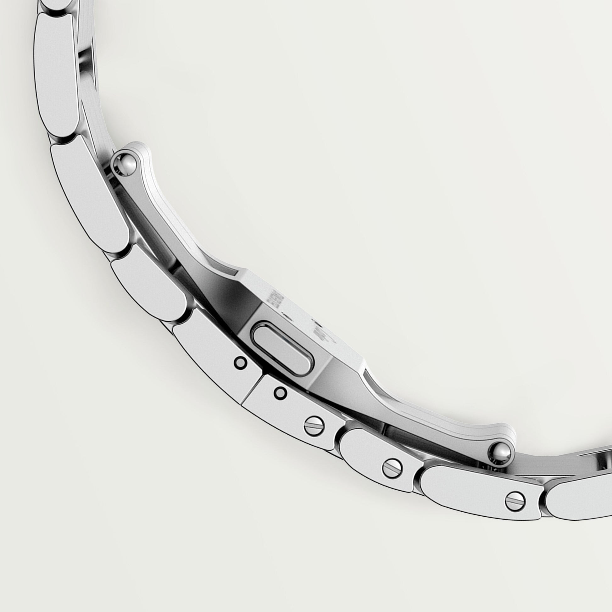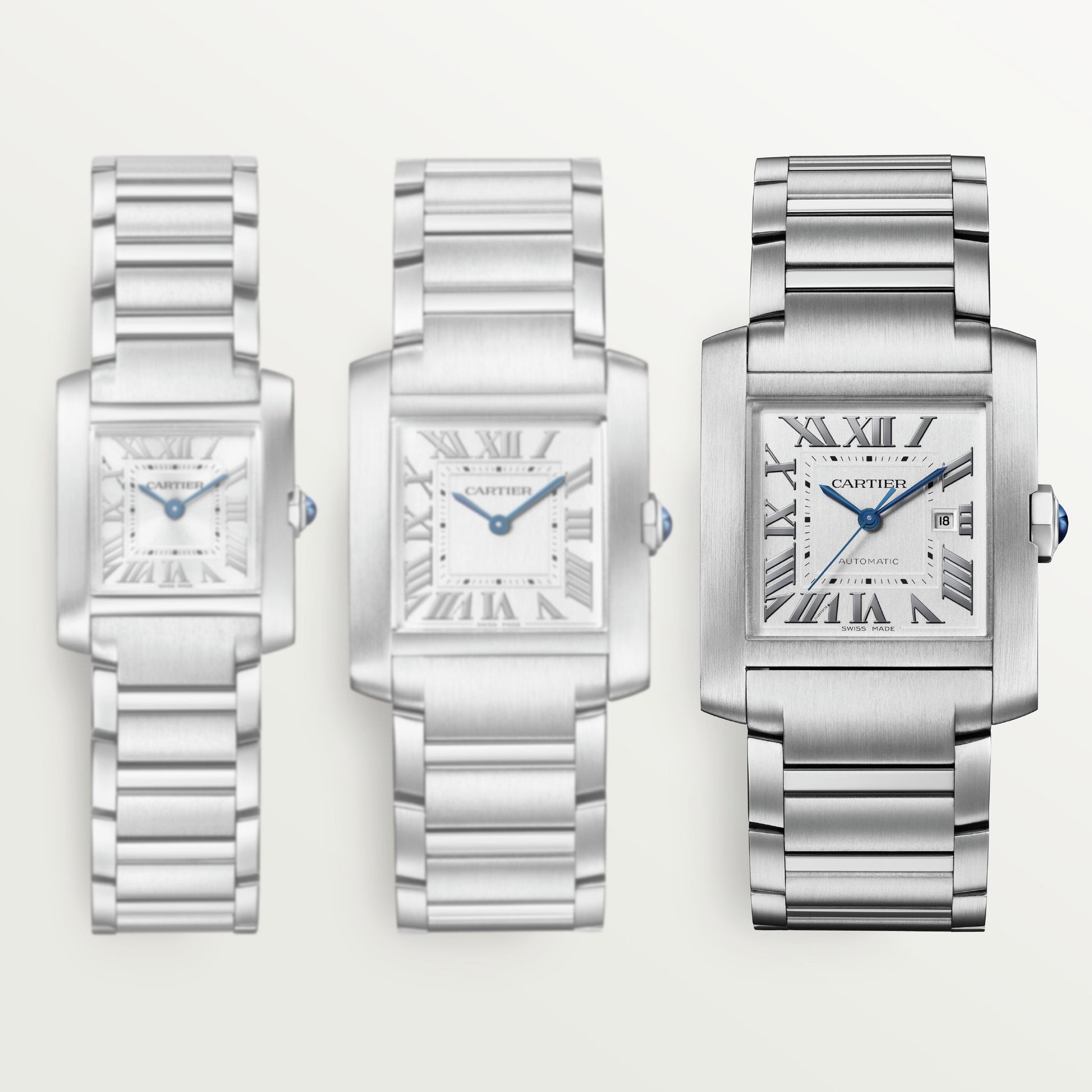 Tank Française watch, large model, mechanical movement with automatic winding. Steel case. Faceted crown in steel decorated with a synthetic cabochon-shaped spinel. Silvered dial, blued-steel sword-shaped hands, sapphire crystal. Steel bracelet. Case dimensions: 36.7 mm x 30.5 mm, thickness: 10.1 mm. Water-resistant to 3 bar (approx. 30 metres).
