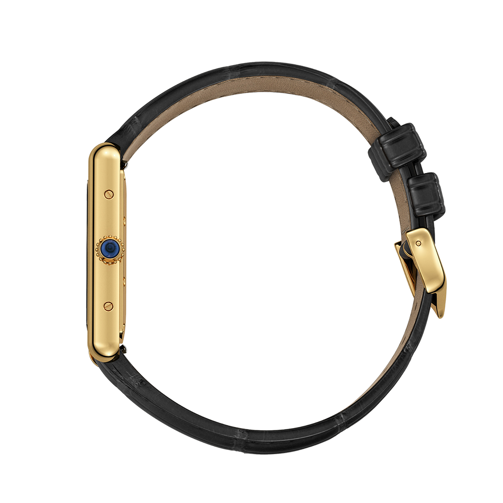 Tank Louis Cartier watch, large model, Manufacture mechanical movement with manual winding. Case in yellow gold 750/1000, beaded crown set with a sapphire, black lacquer dial, golden-finish steel sword-shaped hands, mineral crystal, semi-matte black alligator-skin strap, ardillon buckle in yellow gold 750/1000. Case dimensions: 33.7 mm x 25.5 mm, thickness: 6.6 mm. Water-resistant to 30 metres.