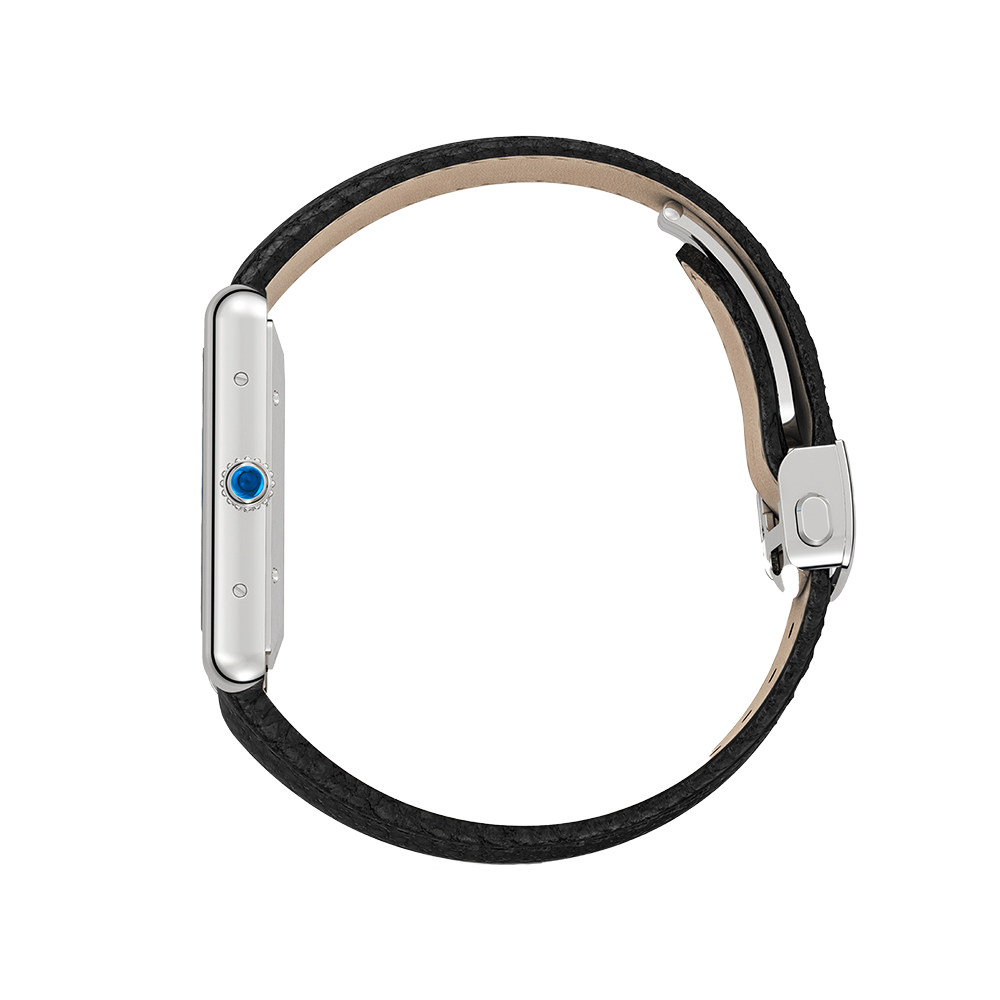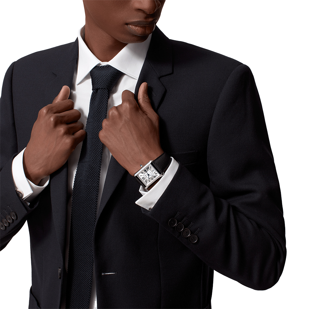 Tank Must watch, extra-large model, mechanical movement with automatic winding, calibre 1847 MC. Steel case, beaded crown set with a synthetic cabochon-shaped spinel, silvered flinqué dial, blued-steel sword-shaped hands, black grained calfskin strap, interchangeable steel folding buckle, calendar aperture at 6 o'clock. Case dimensions: 41 mm x 31 mm, thickness: 8.4 mm. Water-resistant to 3 bar (approx. 30 metres).