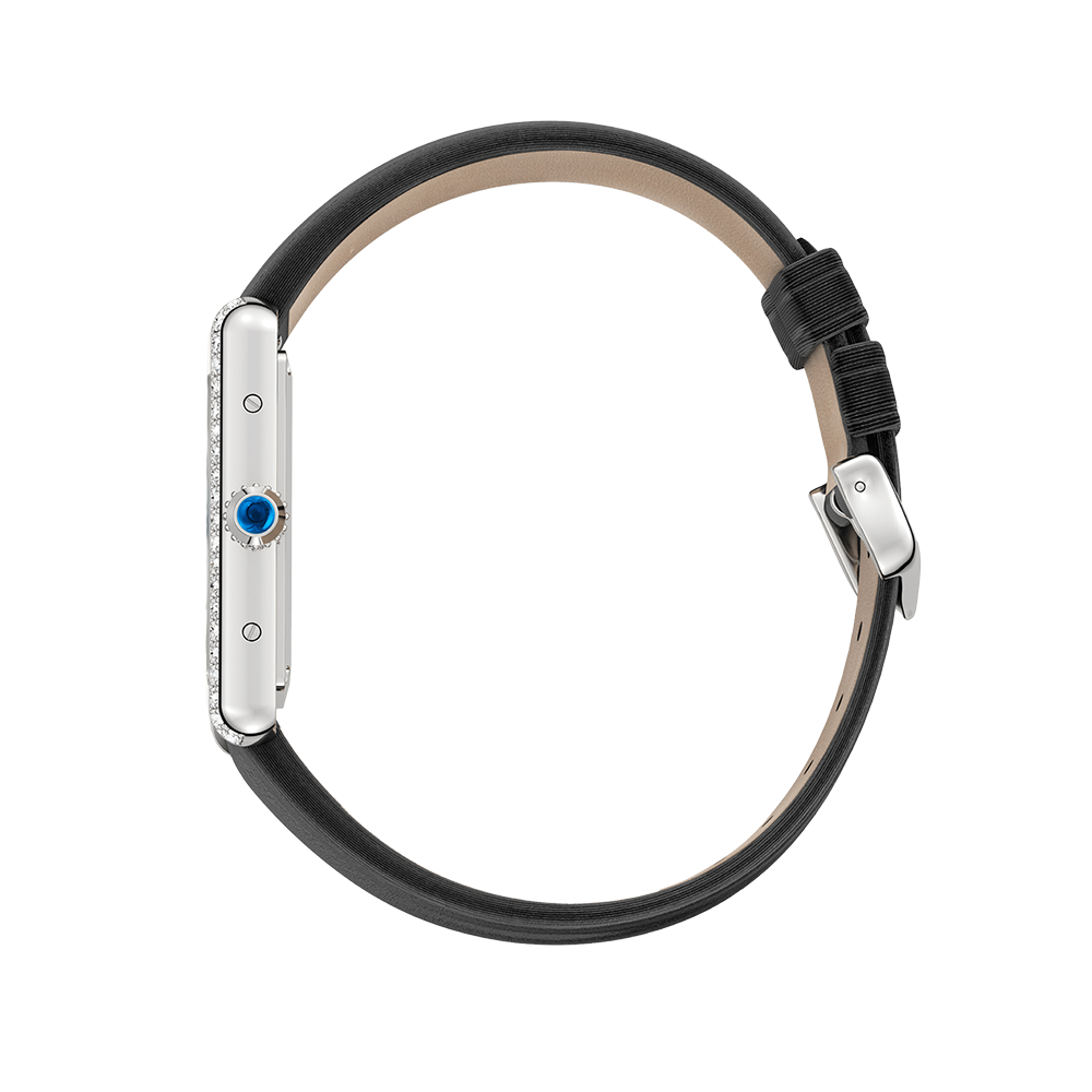 Cartier large model Tank Must watch with a quartz movement. Steel case featuring a bezel set with 42 brilliant-cut diamonds totalling 0.48 carats, beaded crown set with a synthetic cabochon-shaped spinel, silvered dial, blued-steel sword-shaped hands, strap in black brushed calfskin, steel ardillon buckle. Case dimensions: 33.7 mm x 25.5 mm, thickness: 6.6 mm. Water-resistant to 3 bar (approx. 30 metres).