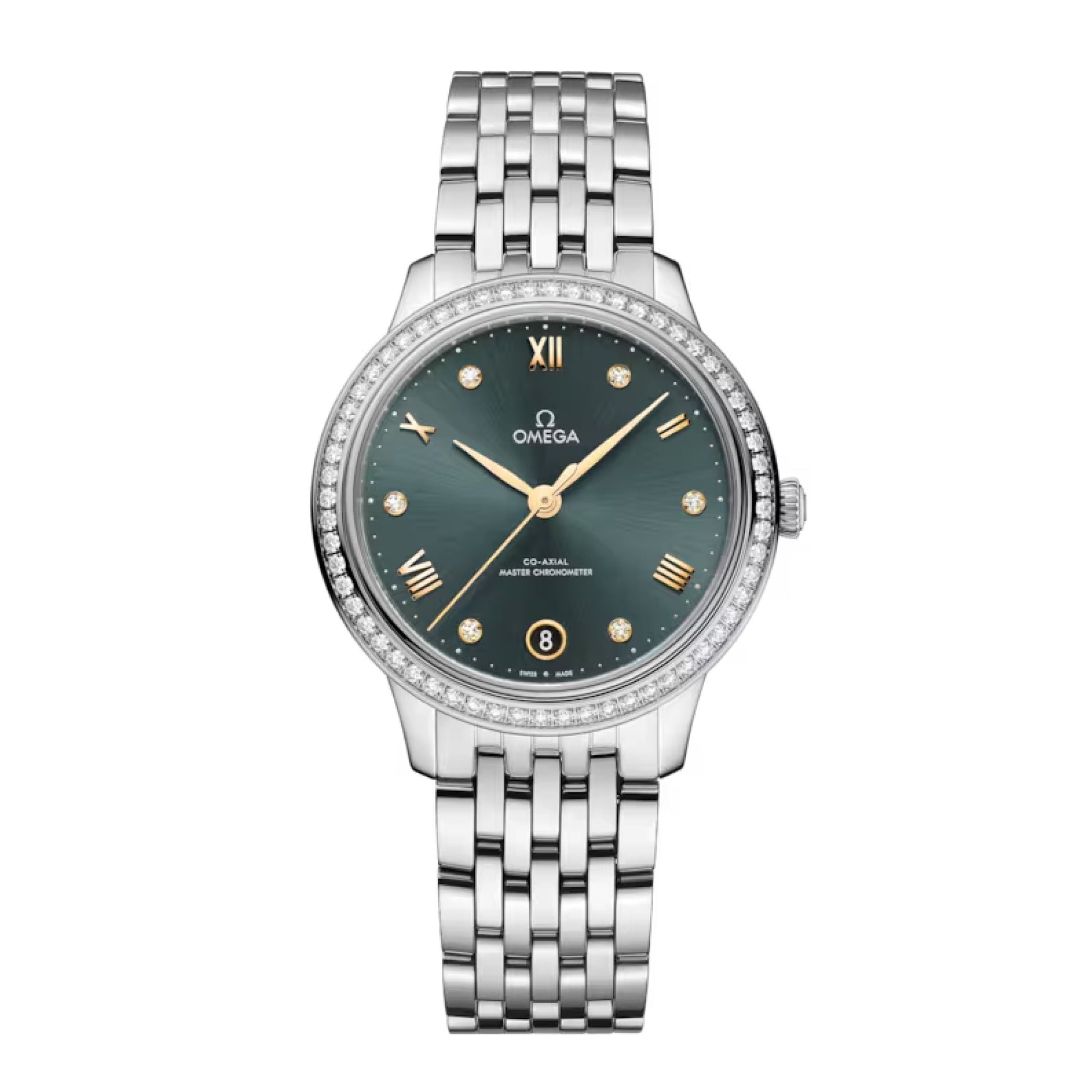 A timeless collection since 1994, the OMEGA De Ville Prestige is now in its third generation. Continuing to represent classical design and refined elegance, the timepieces offer a range of patterns, finishes and colours to suit different lifestyles and personalities. This 34 mm stainless steel model features a diamond-paved bezel and a PVD pine green dial with a sun-brushed finish. The display is distinguished by yellow gold-plated hands, as well as alternating Roman numerals and diamond markers. The pure look of the timepiece is completed by a date window at 6 o’clock, and a dotted minute track on the outer zone. This Master Chronometer certified watch is presented on a stainless steel bracelet and is driven by the OMEGA Master Co-Axial Calibre 8800, which can be admired through the scratch-resistant sapphire crystal caseback.
