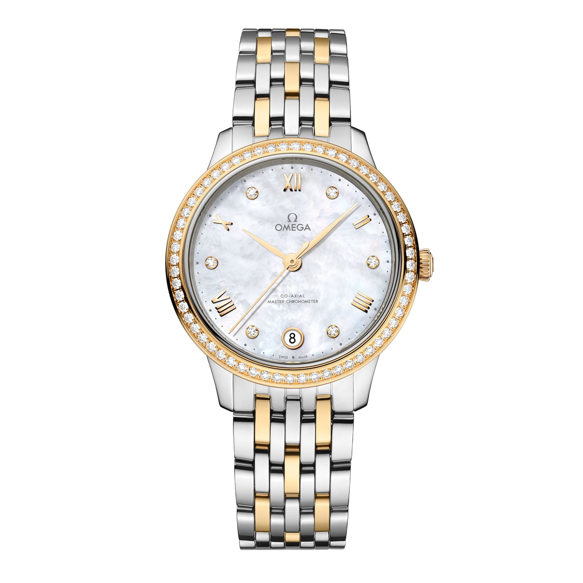 A timeless collection since 1994, the OMEGA De Ville Prestige is now in its third generation. Continuing to represent classical design and refined elegance, the timepieces offer a range of patterns, finishes and colours to suit different lifestyles and personalities. This 34 mm stainless steel and 18K yellow gold model features a diamond-paved bezel and a dial crafted from white mother-of-pearl. The display is distinguished by yellow gold-plated hands, as well as alternating Roman numerals and diamond markers.
