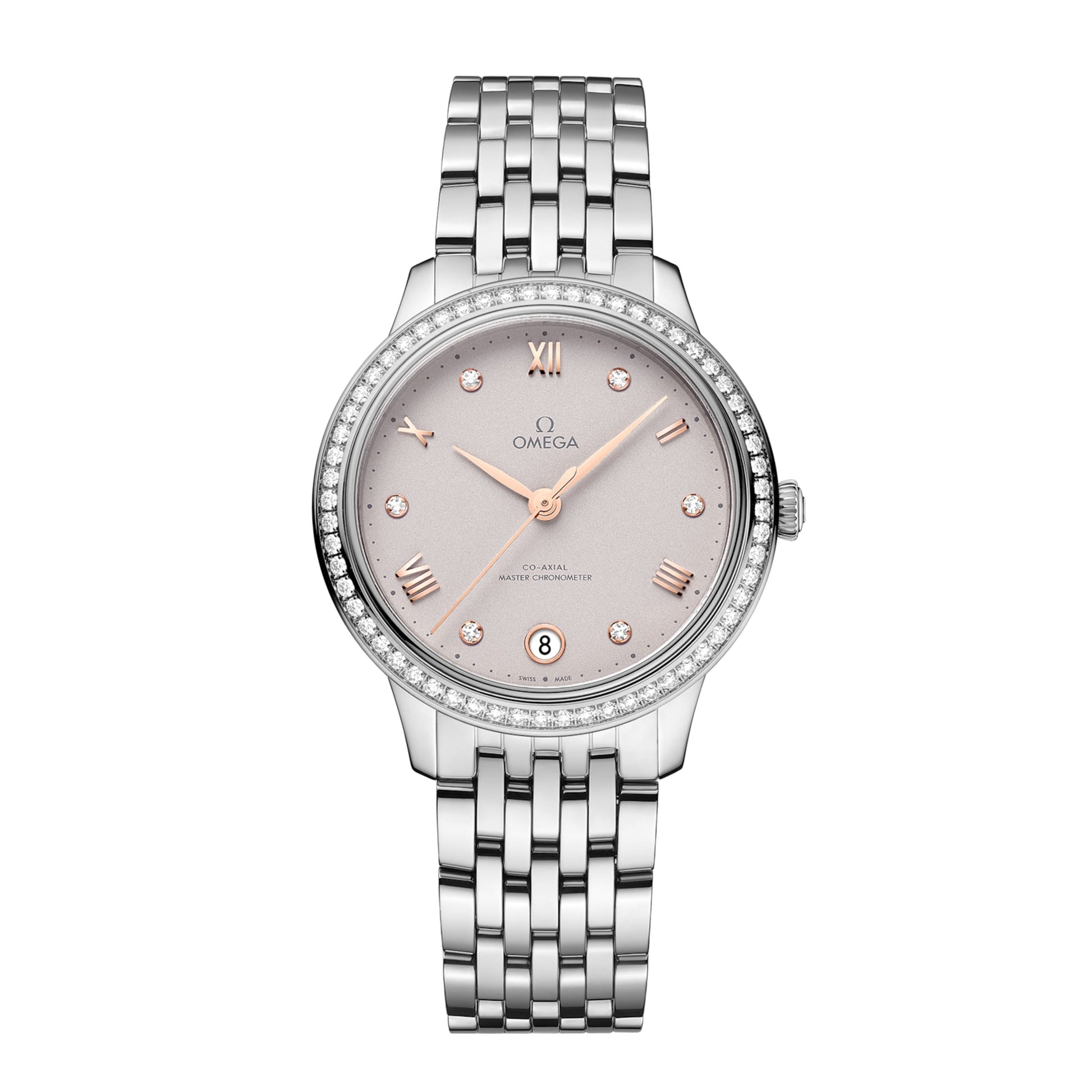 A timeless collection since 1994, the OMEGA De Ville Prestige is now in its third generation. Continuing to represent classical design and refined elegance, the timepieces offer a range of patterns, finishes and colours to suit different lifestyles and personalities. This 34 mm stainless steel model features a diamond-paved bezel and a PVD rose-grey sandy dial with a crystal finish. The display is distinguished by PVD Sedna™ Gold coloured hands, as well as alternating Roman numerals and diamond markers that are set in 18K Sedna™ Gold holders. The pure look of the timepiece is completed by a date window at 6 o’clock, and a dotted minute track on the outer zone. This Master Chronometer certified watch is presented on a stainless steel bracelet and is driven by the OMEGA Master Co-Axial Calibre 8800, which can be admired through the scratch-resistant sapphire crystal caseback.