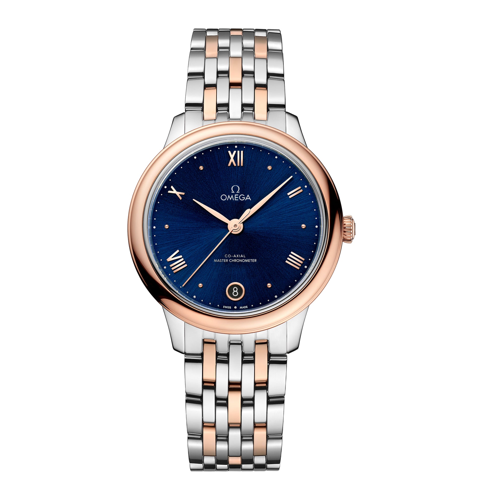 In this 34 mm stainless steel - 18K Sedna™ Gold model, the PVD blue dial features a sun-brushed finish. The display is distinguished by PVD Sedna™ Gold coloured hands, as well as alternating Roman numerals and cabochon indexes.