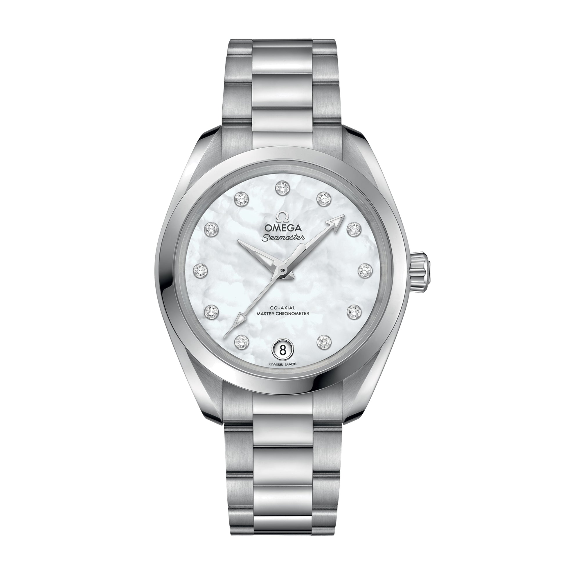 Encircled by diamonds, the ladies' Seamaster Aqua Terra is the true definition of elegance. With a symmetrical 34 mm case, this stainless steel model features a white pearled mother-of-pearl dial with a date window at 6 o’clock and 11 diamond indexes in rhodium-plated holders. The watch is presented on an integrated stainless steel bracelet and is driven by the OMEGA Co-Axial Master Chronometer calibre 8800, certified at the industry’s highest standard by the Swiss Federal Institute of Metrology (METAS).